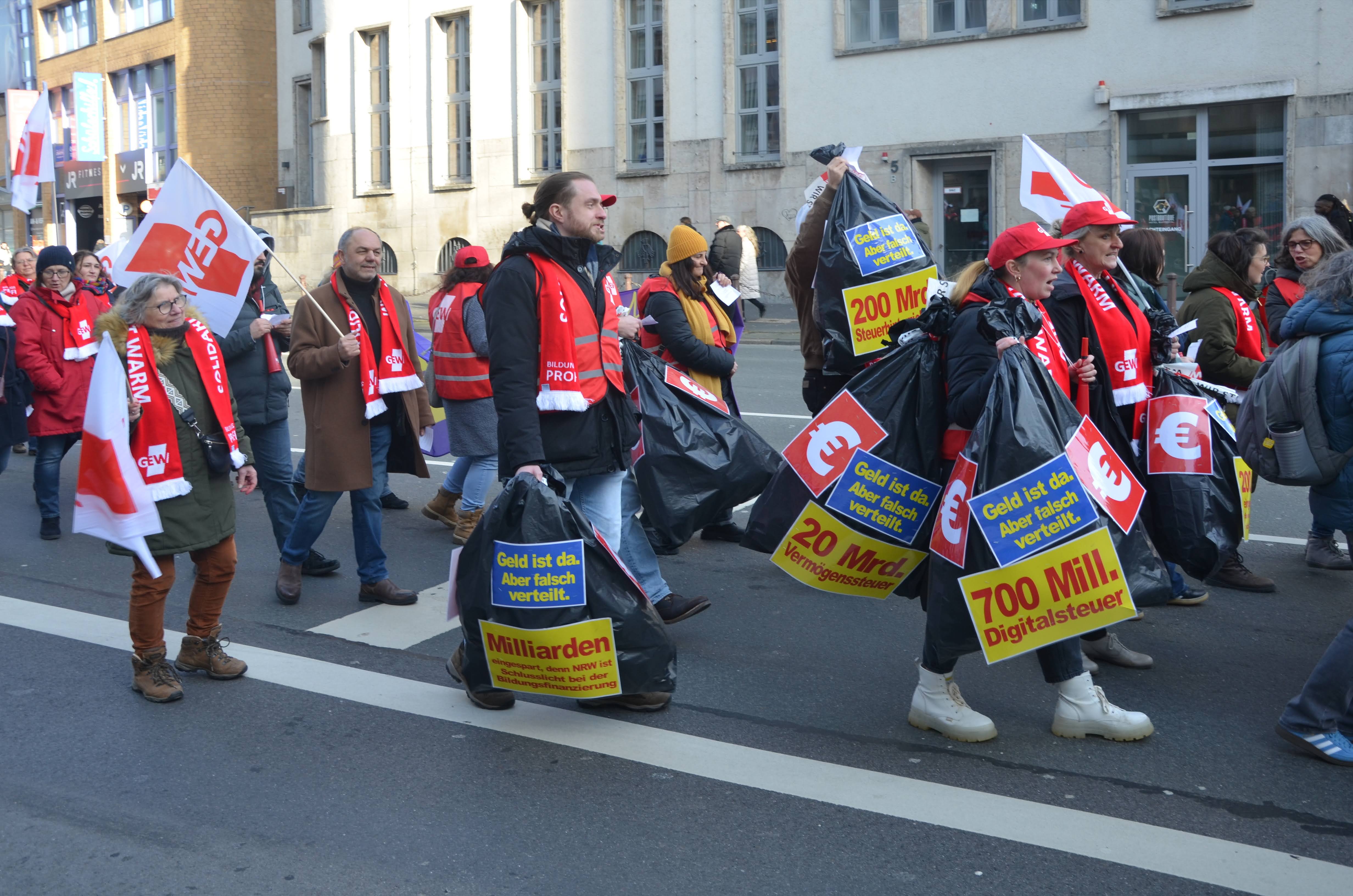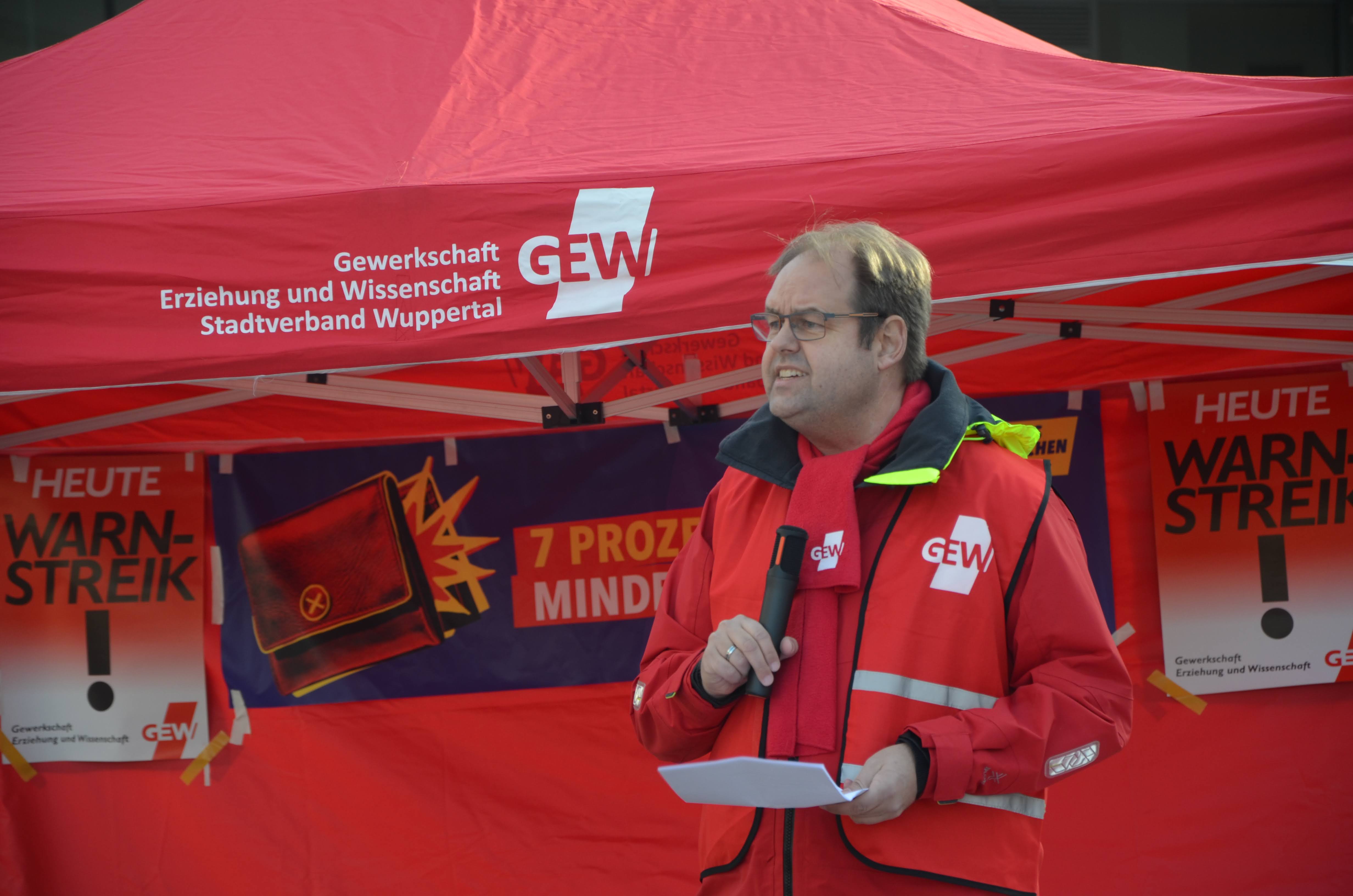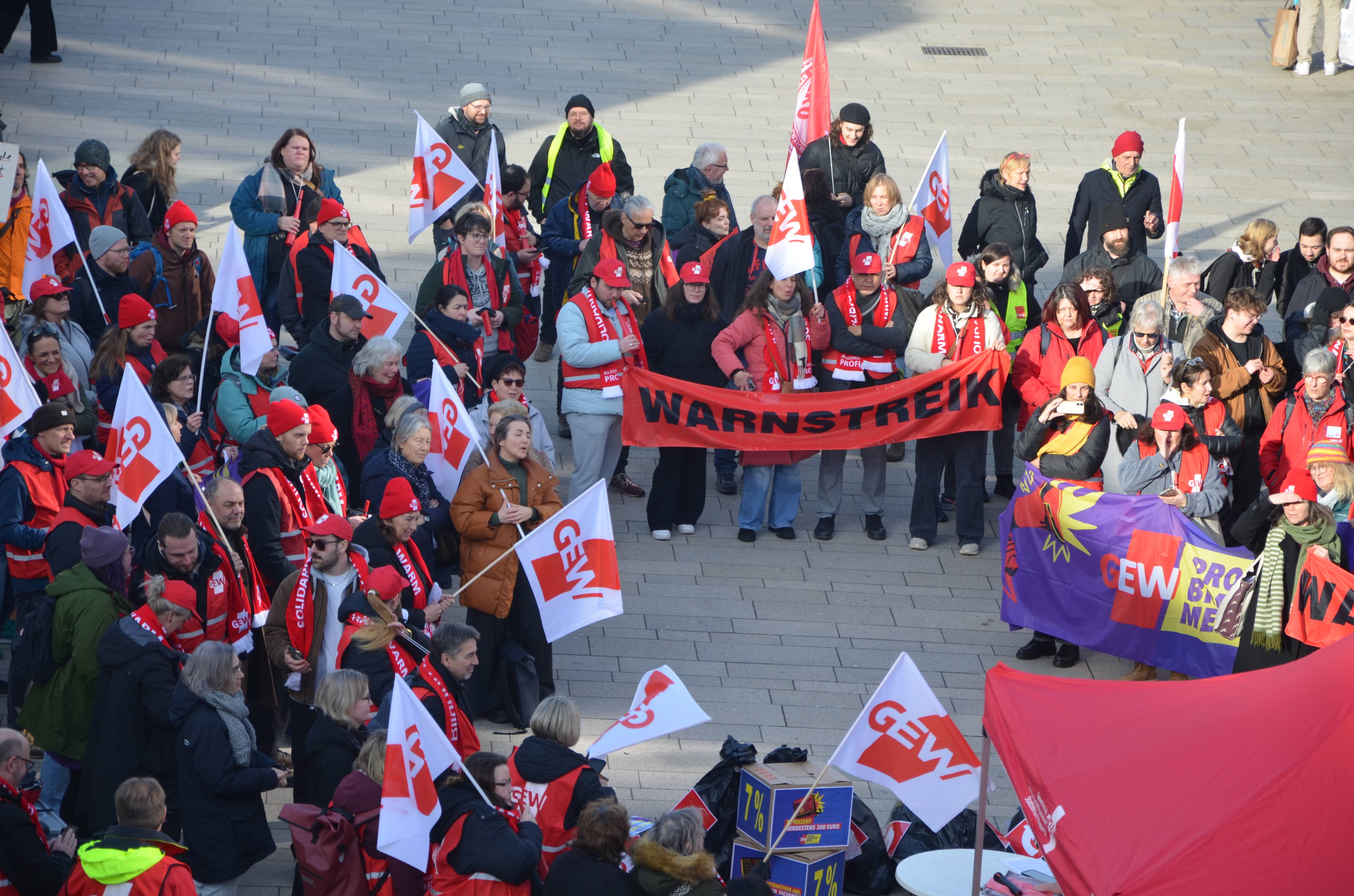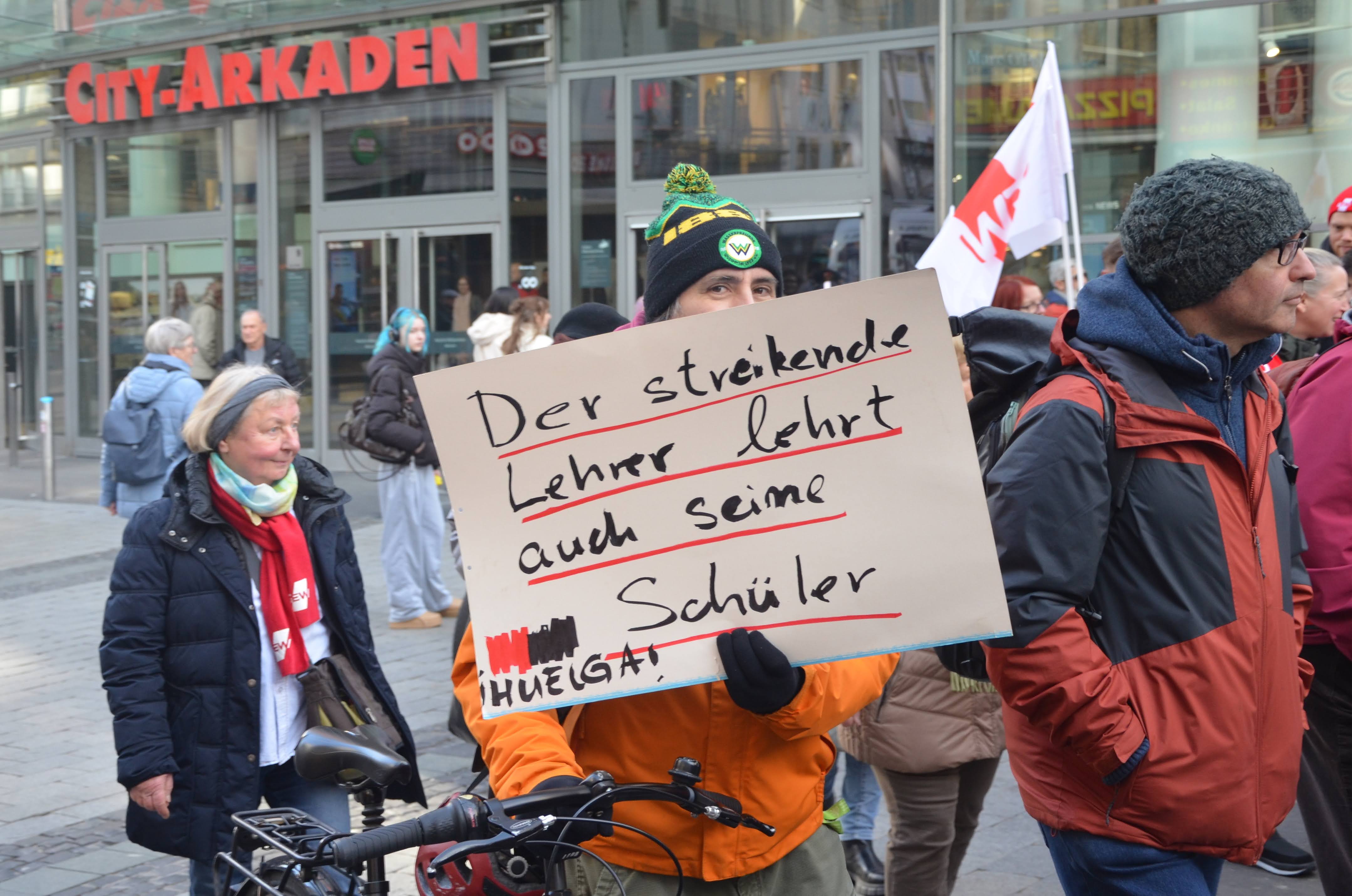 Richard Voß widerlegt bei der Kundgebung auf dem Bahnhofsvorplatz die Behauptung der Arbeitgeber, sie hätten kein Geld, sie müssten leider, leider auch bei der Bildung sparen. “Geld ist genug da, es wird nur falsch verteilt. Unsere Regierungen sorgen dafür, dass die Reichen immer reicher werden und die Bildung sträflich vernachlässigt wird. 200 Milliarden mehr in der Kasse, wenn die Steuerhinterziehung endlich bekämpft wird, 700 Millionen mehr, wenn endlich die Digitalsteuer kommt, 17 Milliarden bringt eine Reform der Erbschaftssteuer, 20 Milliarden bringt eine Vermögenssteuer. Und die 200 Millionen, die das Land jährlich einspart, weil 8000 Lehrkräfte fehlen, die wollen wir für die Beschäftigten haben!"
